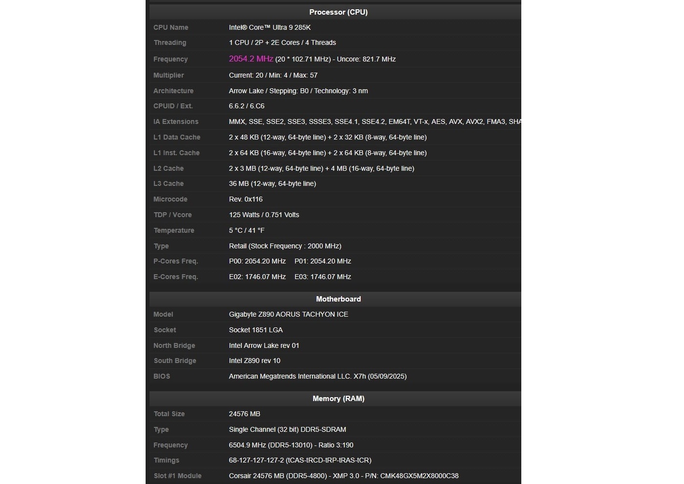 Yeni rekor, Corsair Vengeance serisine ait tek bir 24 GB DDR5 modül (CMK48GX5M2X8000C38) kullanılarak elde edildi. Bellek, Gigabyte Z890 AORUS Tachyon Ice anakart ve Intel Core Ultra 9 285K işlemciden destek alıyor. Ayrıca iki bileşen de sıvı nitrojen soğutma altında çalıştırılmış. Testte işlemci, 2P+2E çekirdek konfigürasyonuyla sınırlı şekilde ve çekirdek frekansları ise 2054,2 MHz, uncore frekansı ise 821,7 MHz olarak görülüyor.