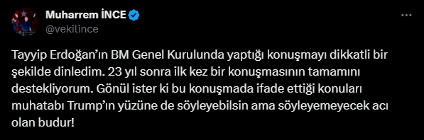 Muharrem İnce, sosyal medya hesabından Cumhurbaşkanı Erdoğan’ın BM Genel Kurulunda yaptığı konuşmaya ilişkin değerlendirmelerde bulundu.